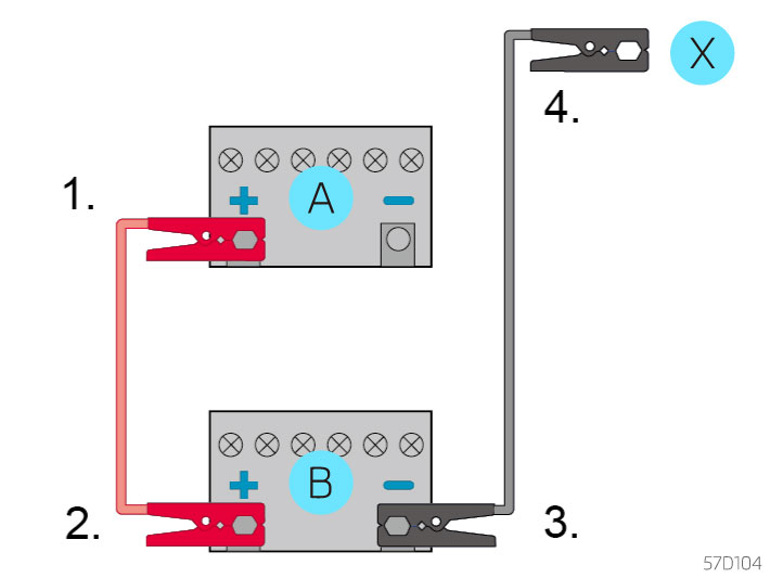 - При работающих двигателях отсоединяйте пусковые кабели в обратной последовательности.